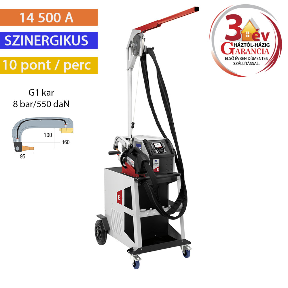 A GYSPOT PTI EXPERT egy automatikus ponthegesztő gép, amelyet karosszériaelemek összeállítására terveztek. Kézi túlnyitási mechanizmussal rendelkezik a felhasználói kényelem növelése érdekében, valamint egy kiegyensúlyozó karral, amely csökkenti a pisztoly súlyát. A folyadékhűtéses fogóba integrált transzformátor található, és 360°-ban elforgatható, így a nehezen hozzáférhető helyeken is könnyen lehet hegeszteni. Emellett ergonomikus, felhasználóbarát, színes kezelőfelülettel van ellátva.